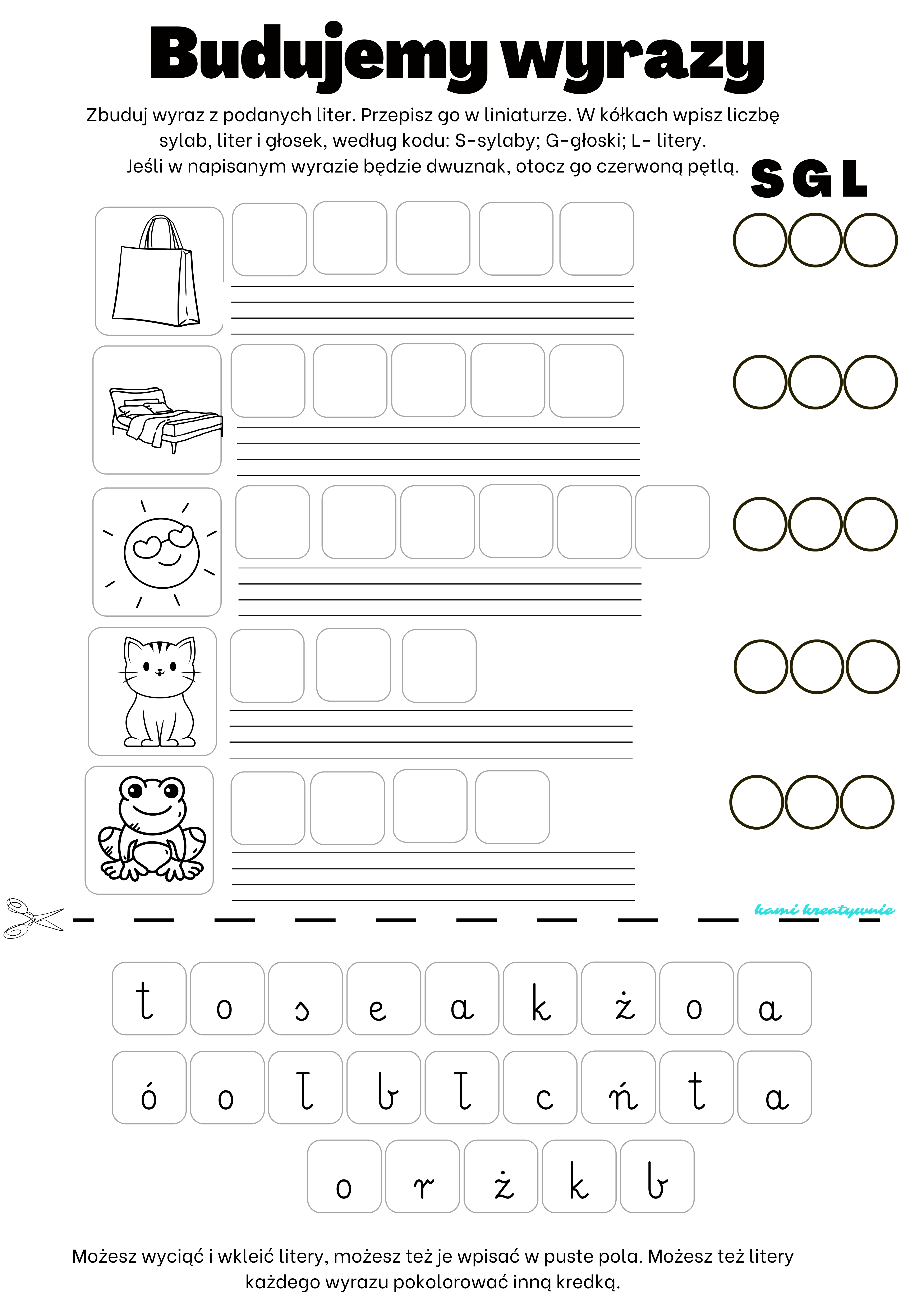 W materiale 30 kart, które ćwiczą wiele umiejętności: analizę, syntezę wyrazową, wzbogacanie słownika, głoski, sylaby, litery, motorykę małą.