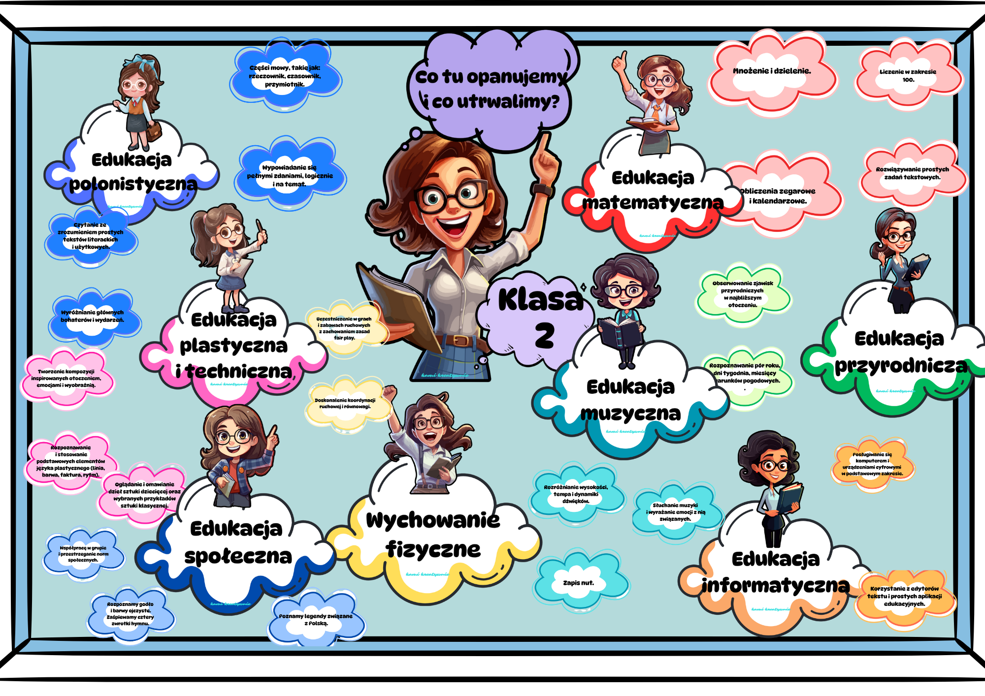 📌 Przejrzysta i kolorowa gazetka, która w atrakcyjny sposób prezentuje najważniejsze umiejętności, jakie uczniowie zdobywają i doskonalą w klasie drugiej.