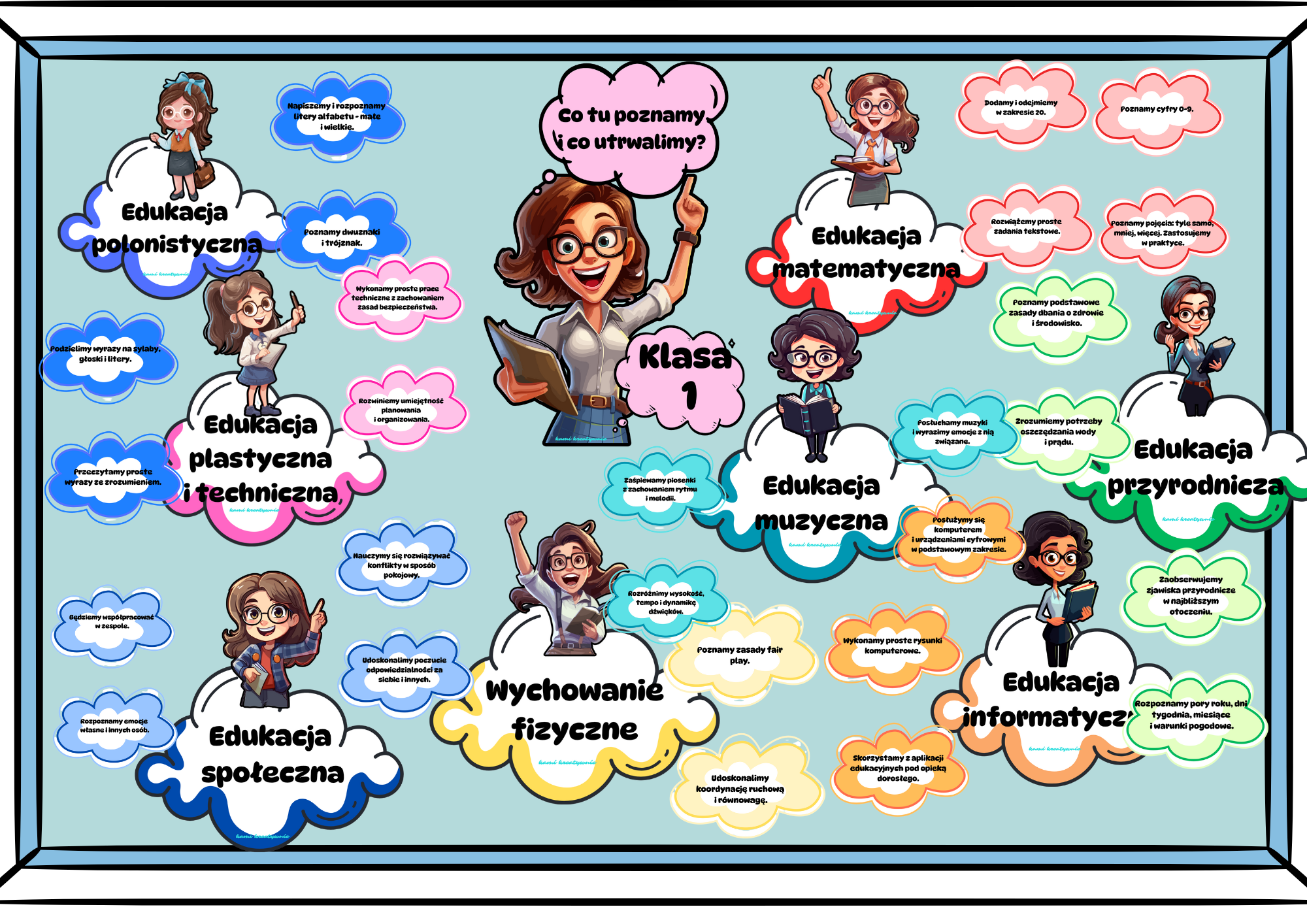 📌 Przejrzysta i kolorowa gazetka, która w atrakcyjny sposób prezentuje najważniejsze umiejętności, jakie uczniowie zdobywają i doskonalą w klasie pierwszej.