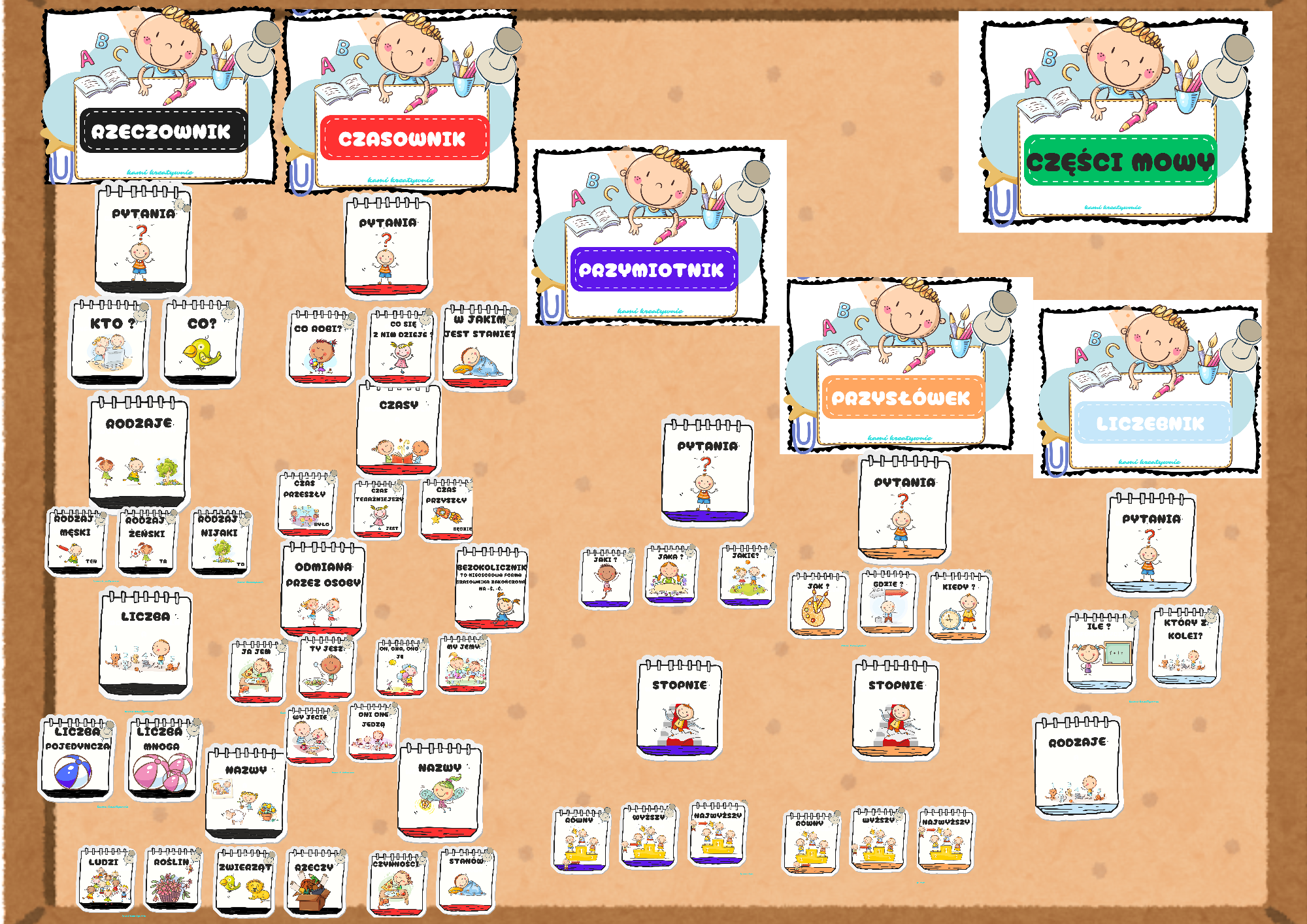 Kolory w częściach mowy dostosowane są do barw według Montessori.