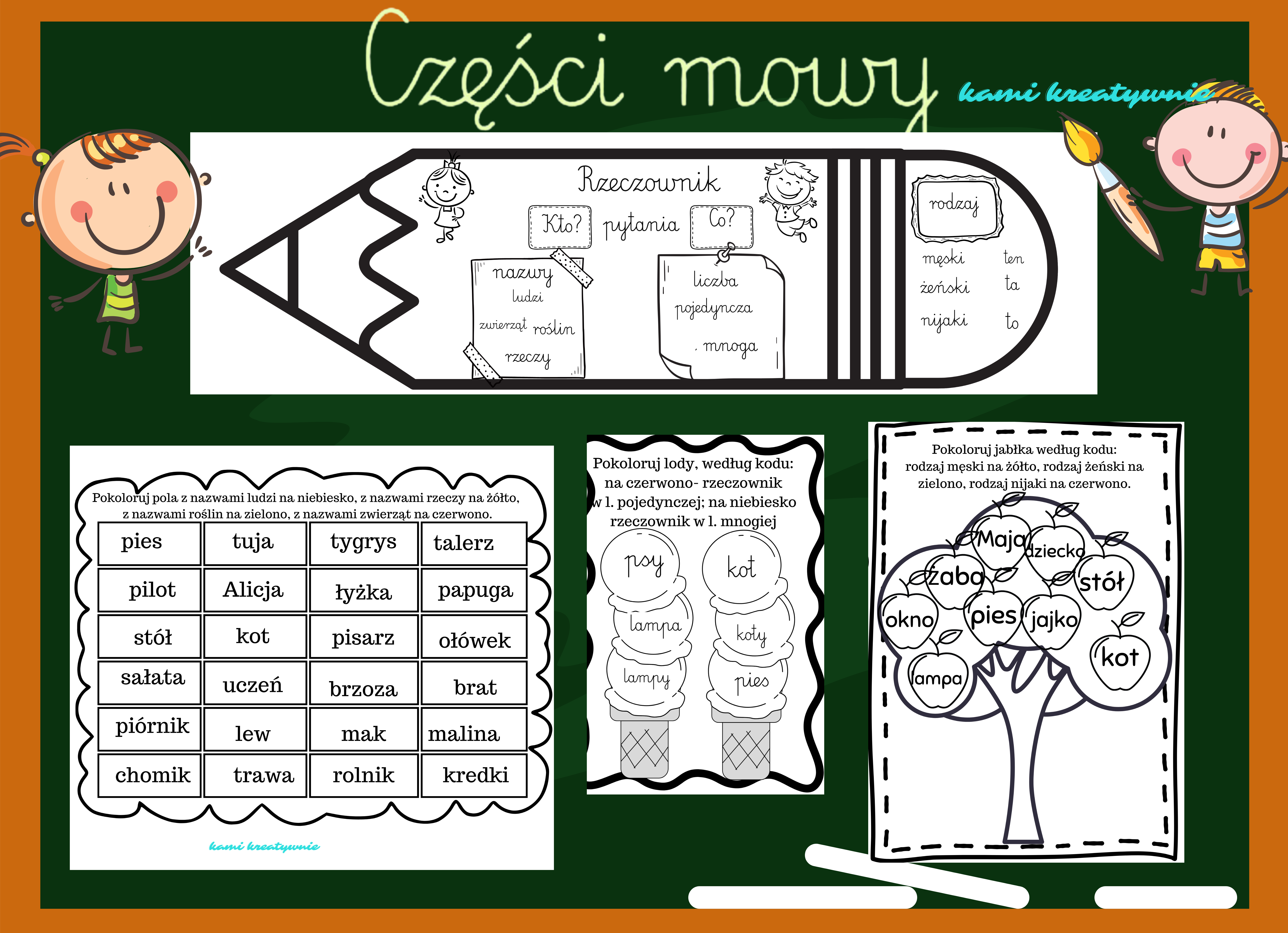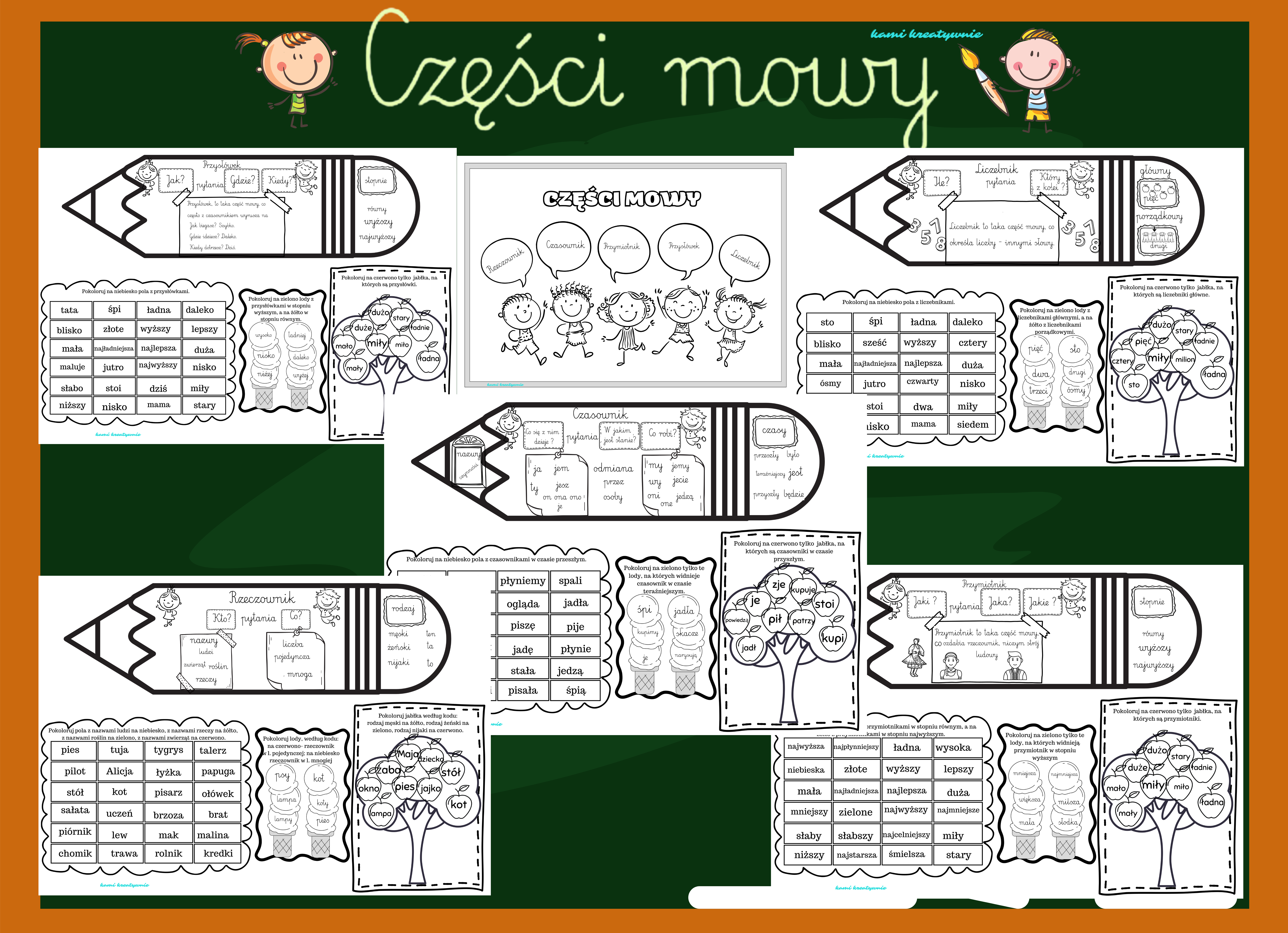 W materiale 5 kart z częściami mowy.
