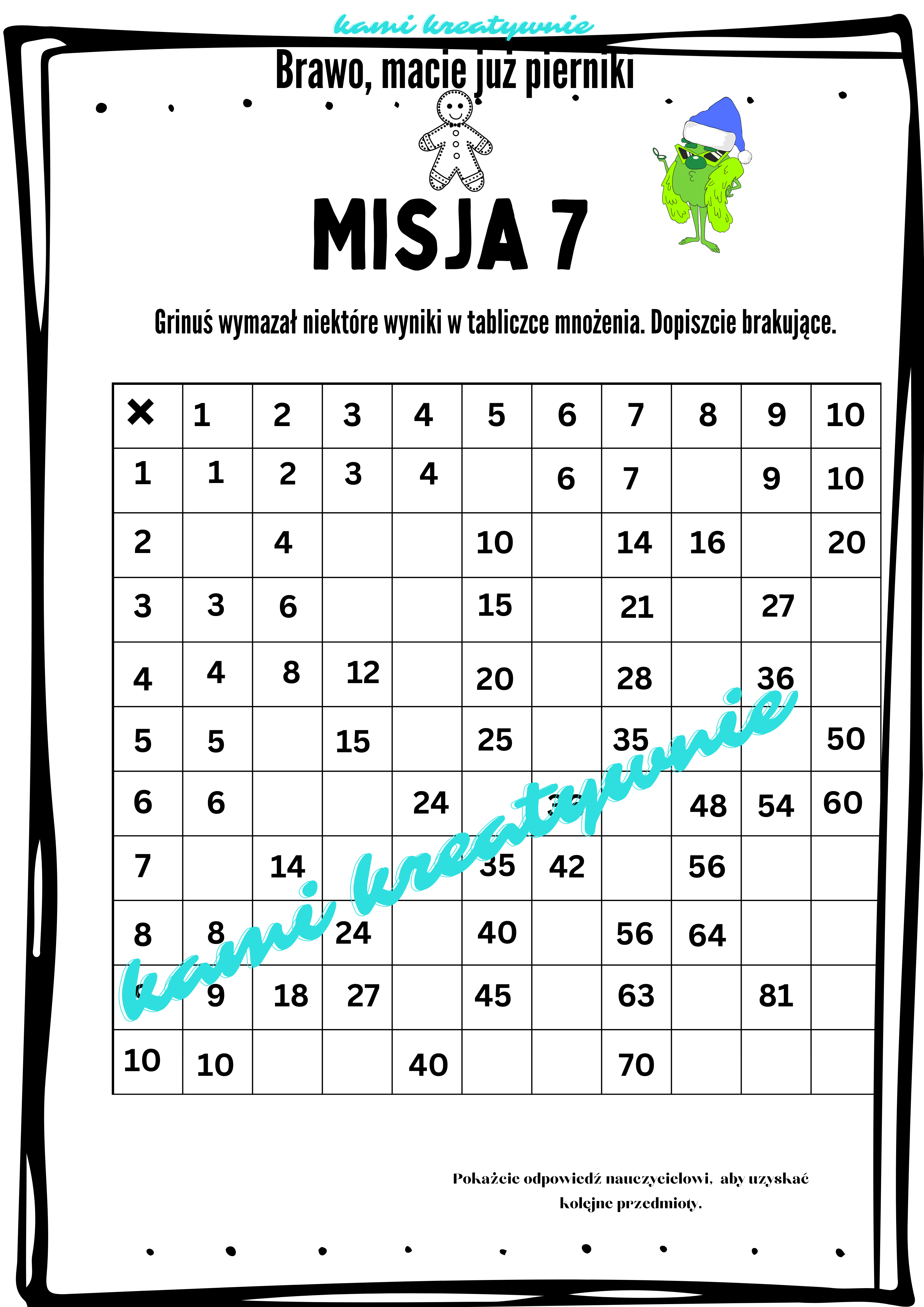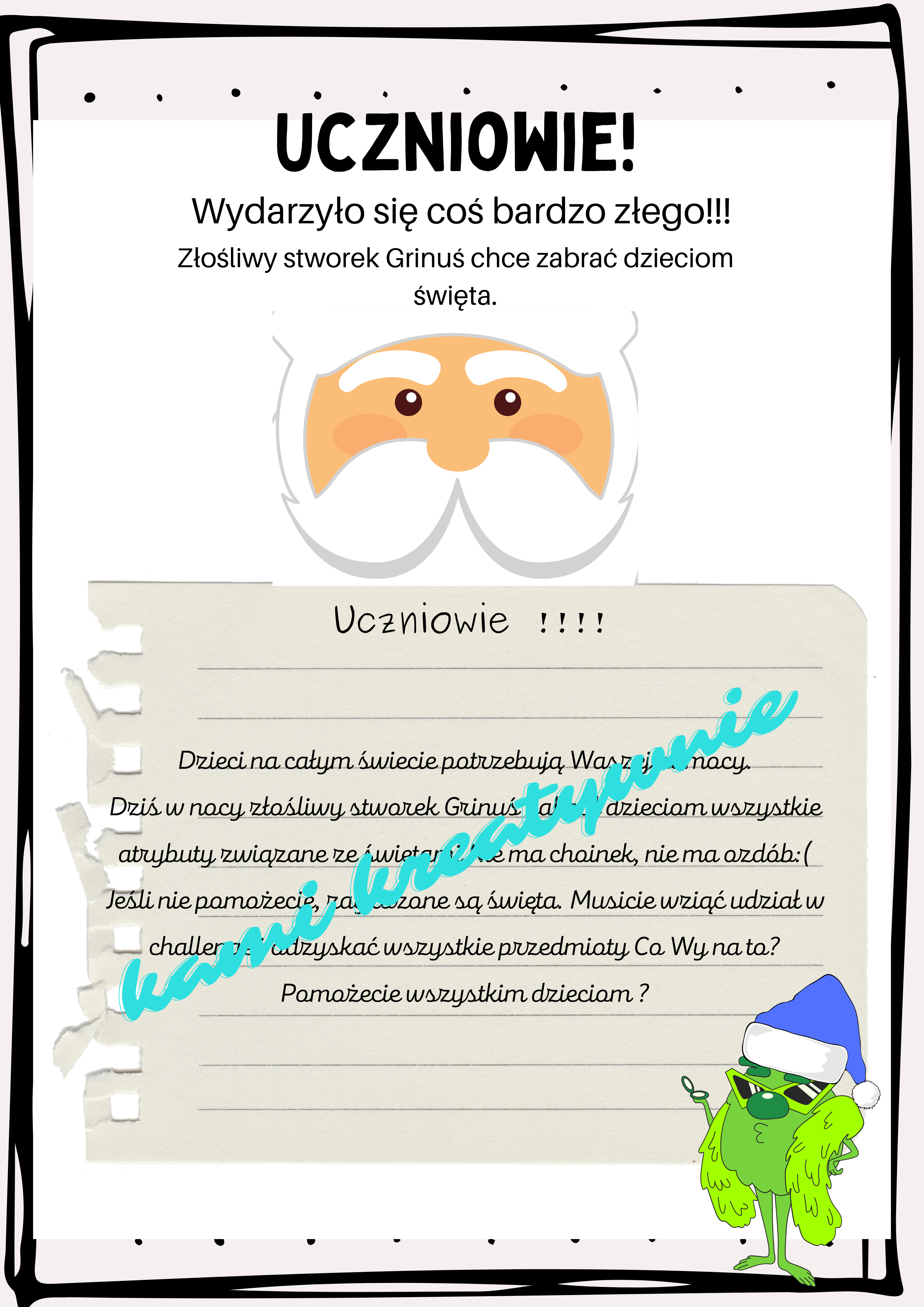 Złośliwy stworek Grinuś chce zepsuć święta, aby mu przeszkodzić, uczniowie muszą wziąć udział w challengu. Challenge polega na rozwiązaniu 8 zadań- misji, po których dzieci odzyskują poszczególne atrybuty świąteczne.