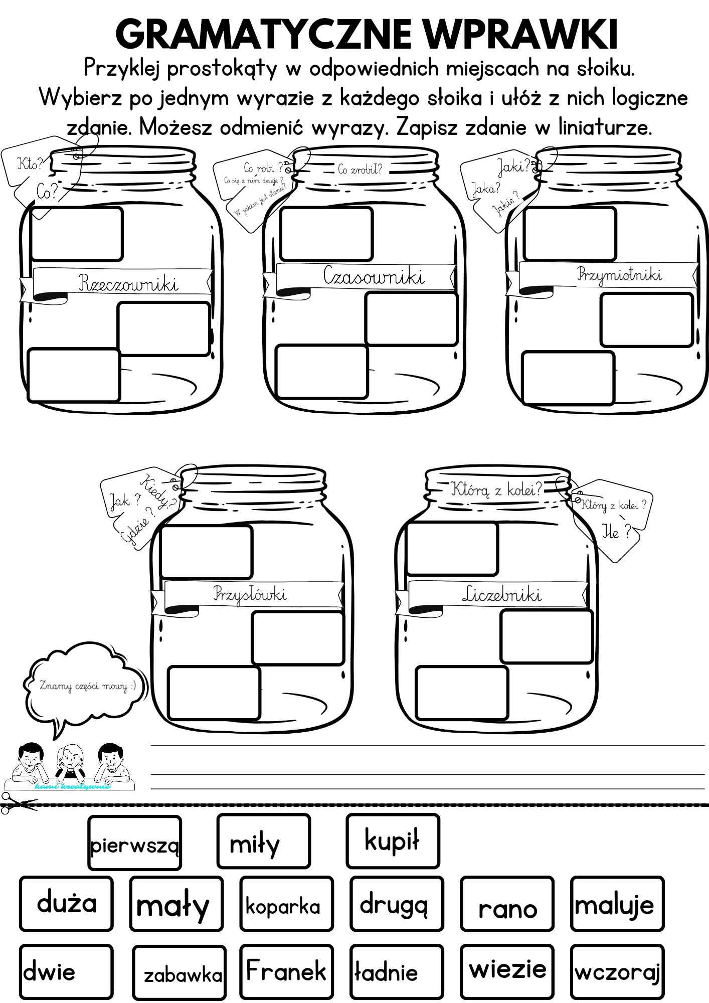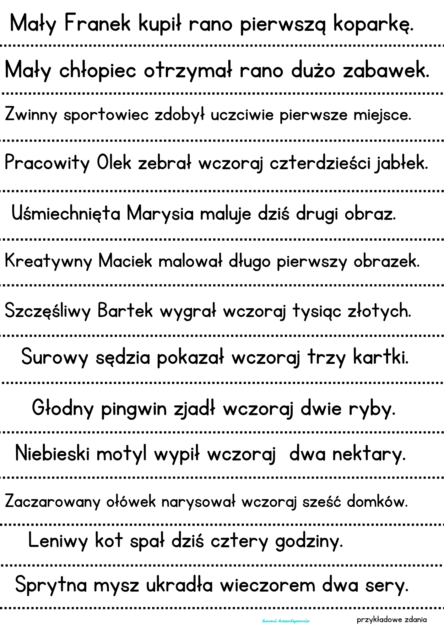 Dodatkowo dołożyłam przykładowe zdania, które może dziecko ułożyć z rozsypanek. Uczeń sam musi odmienić wyrazy, aby zdanie tworzyło logiczną całość. Możecie te zdania wydrukować i ewentualnie dać dziecku na wzór, gdyby miało trudność w ułożeniu zdania.