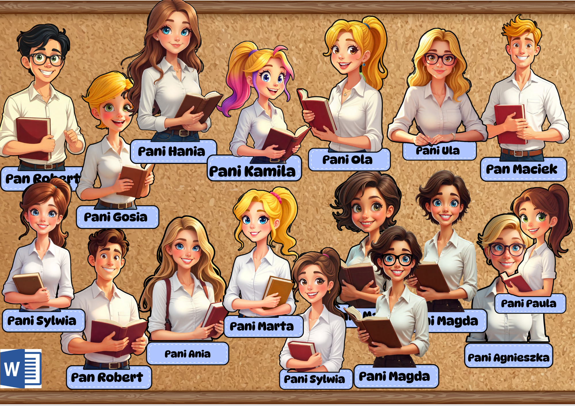 W materiale sylwety dzieci i nauczycieli do stworzenia gazetki klasowej z imionami do edycji w word.
