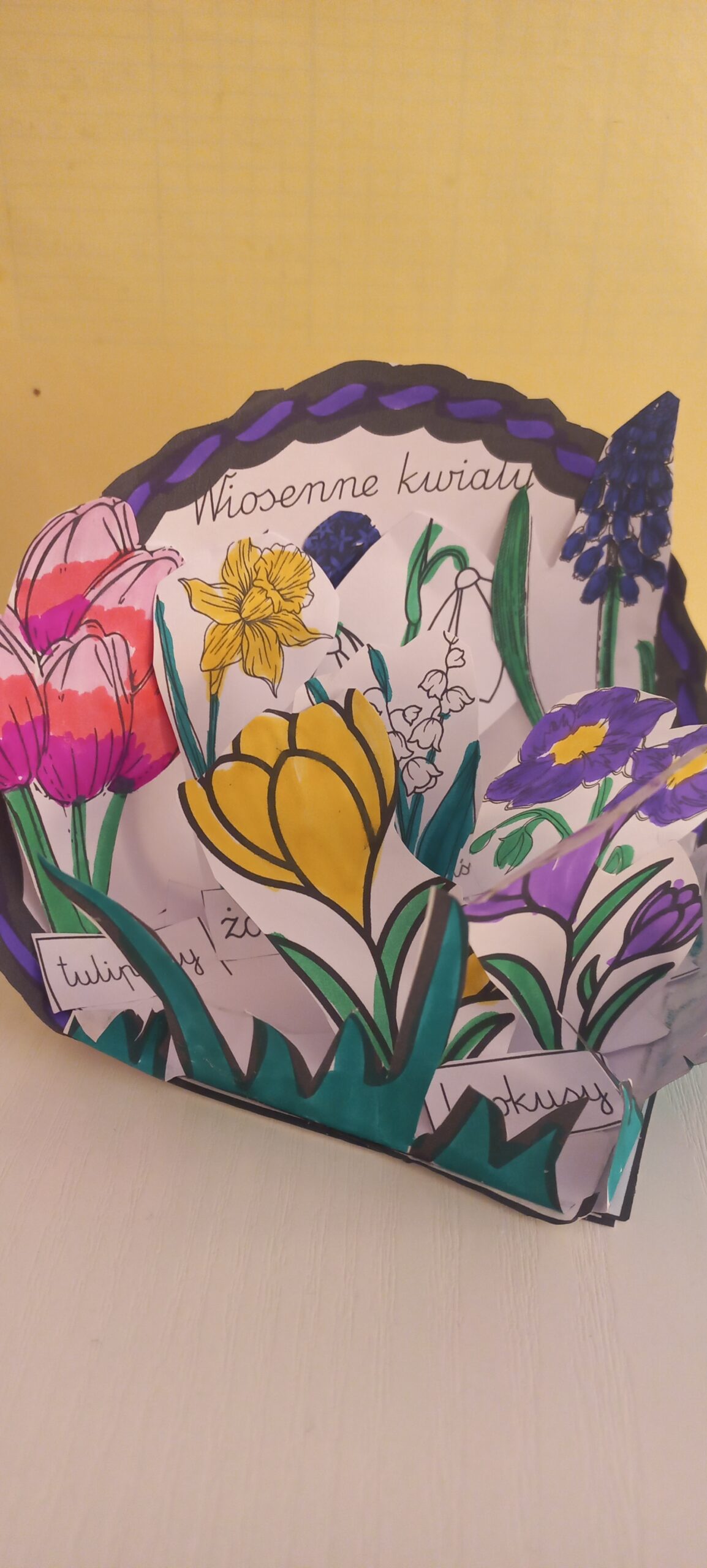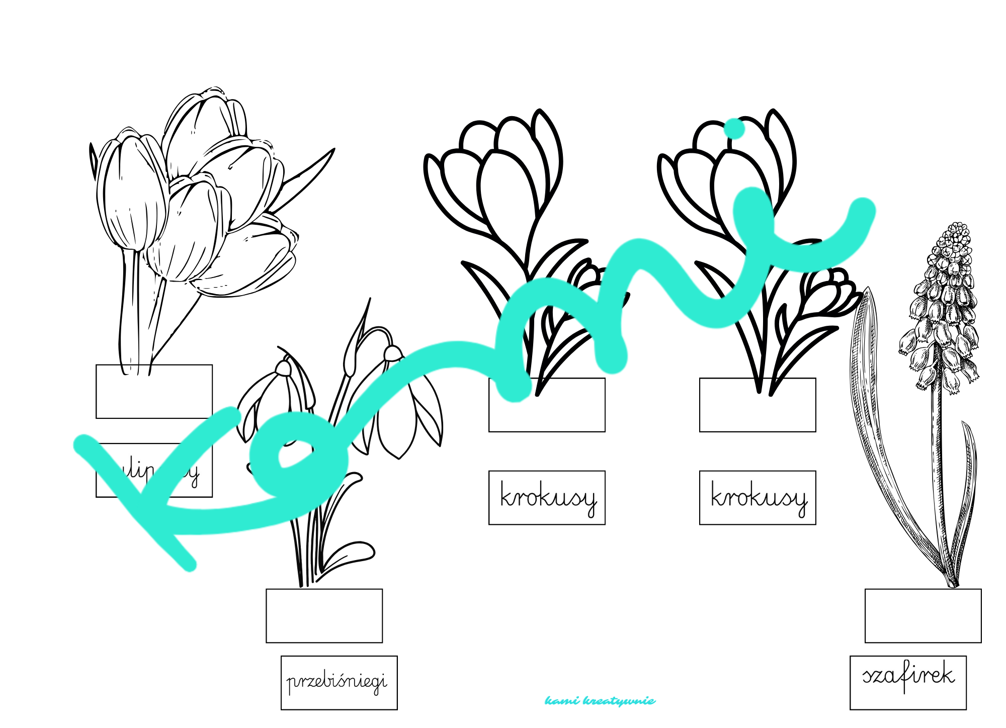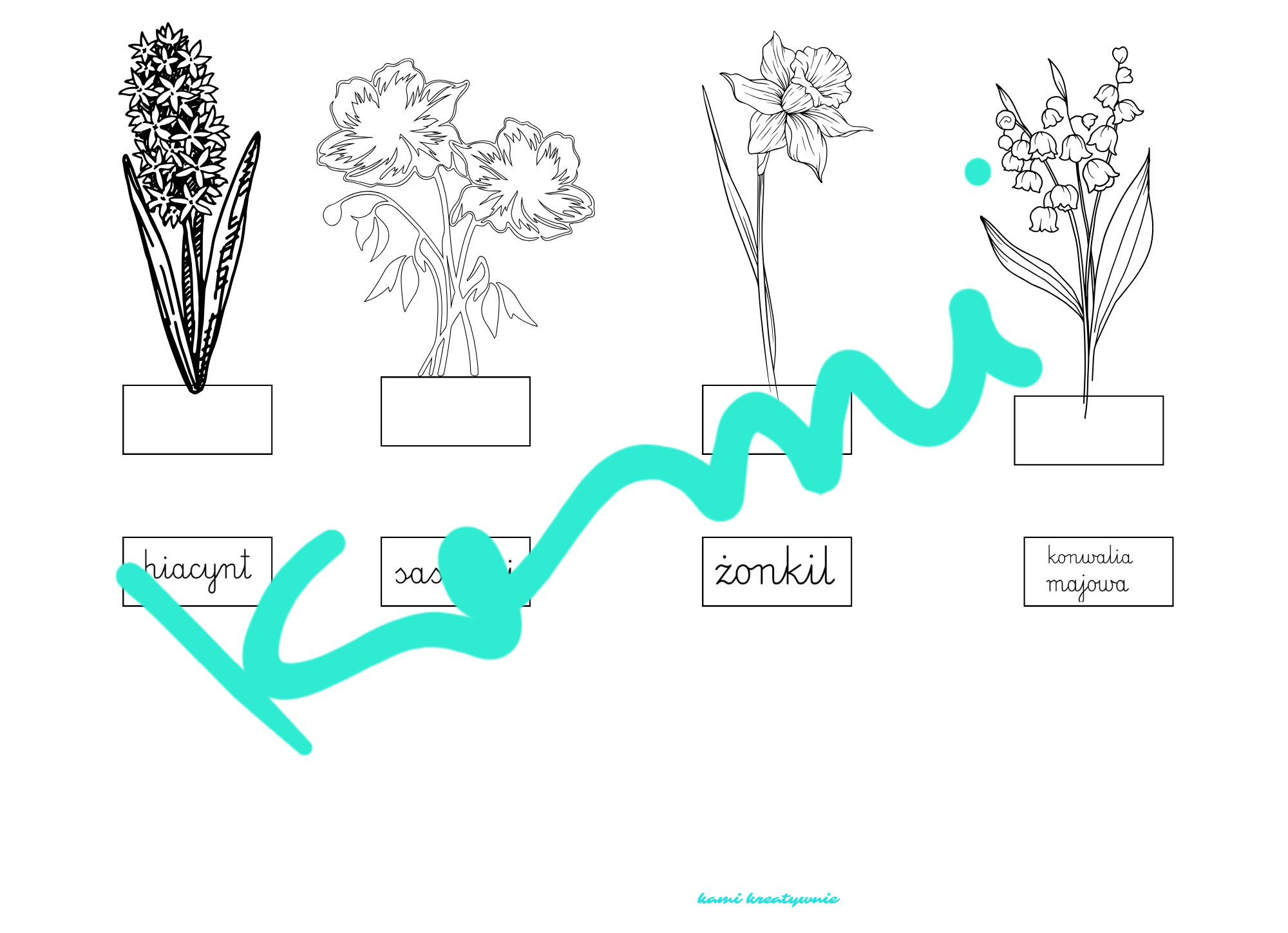 – koszyczek- wiosenne kwiaty- ilustracje i podpisy.