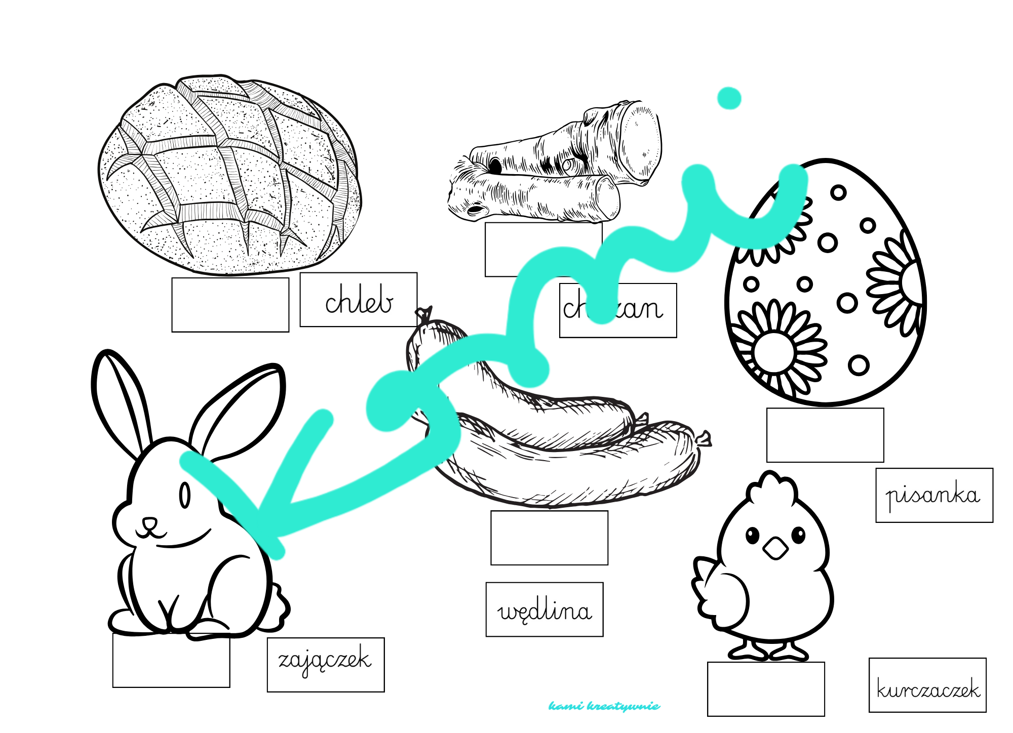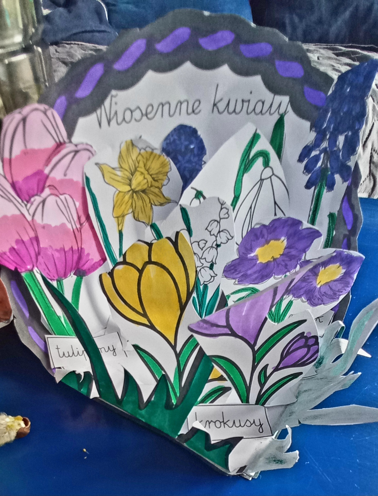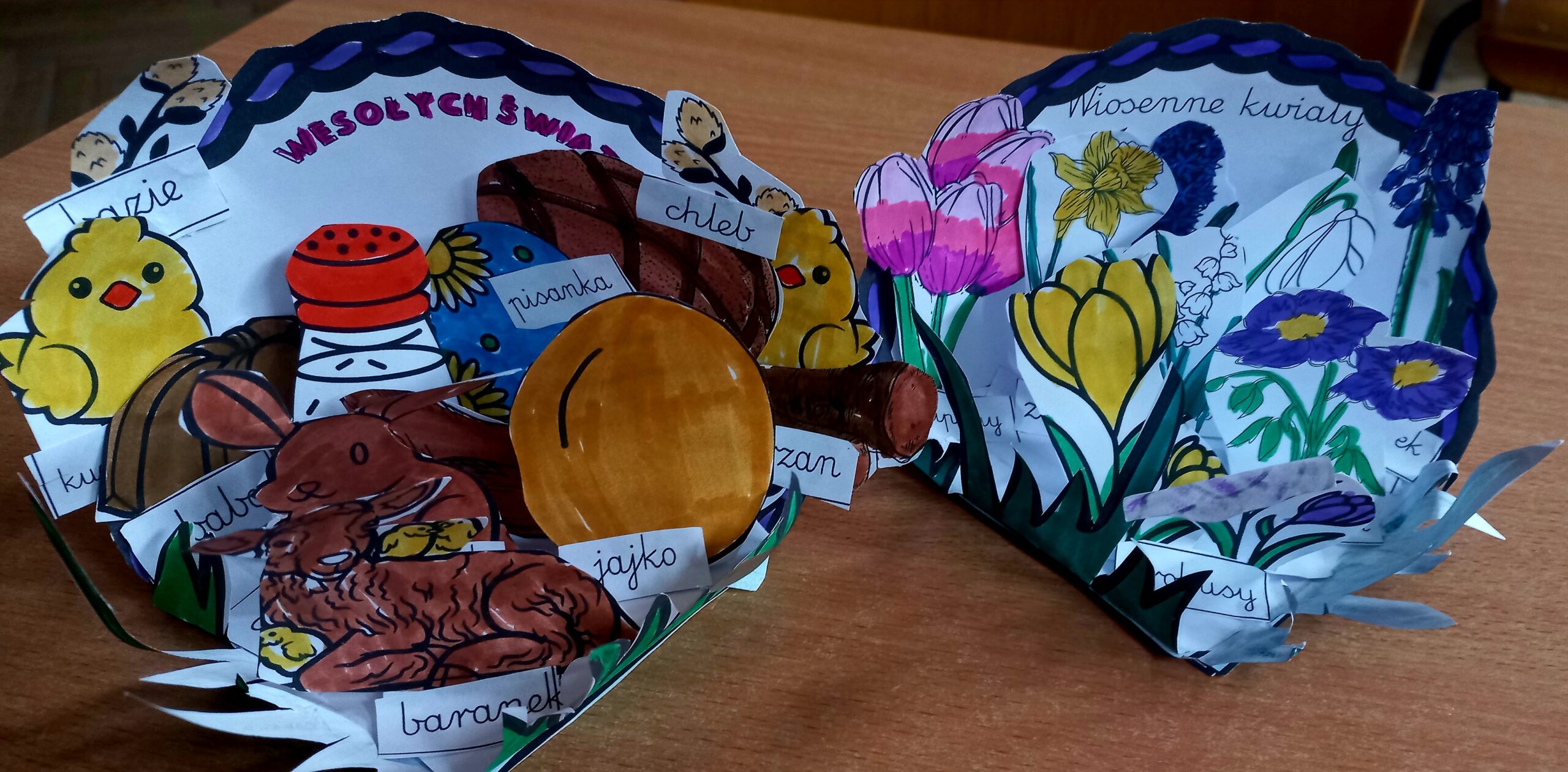 – koszyczek- wiosenne kwiaty- ilustracje i podpisy.