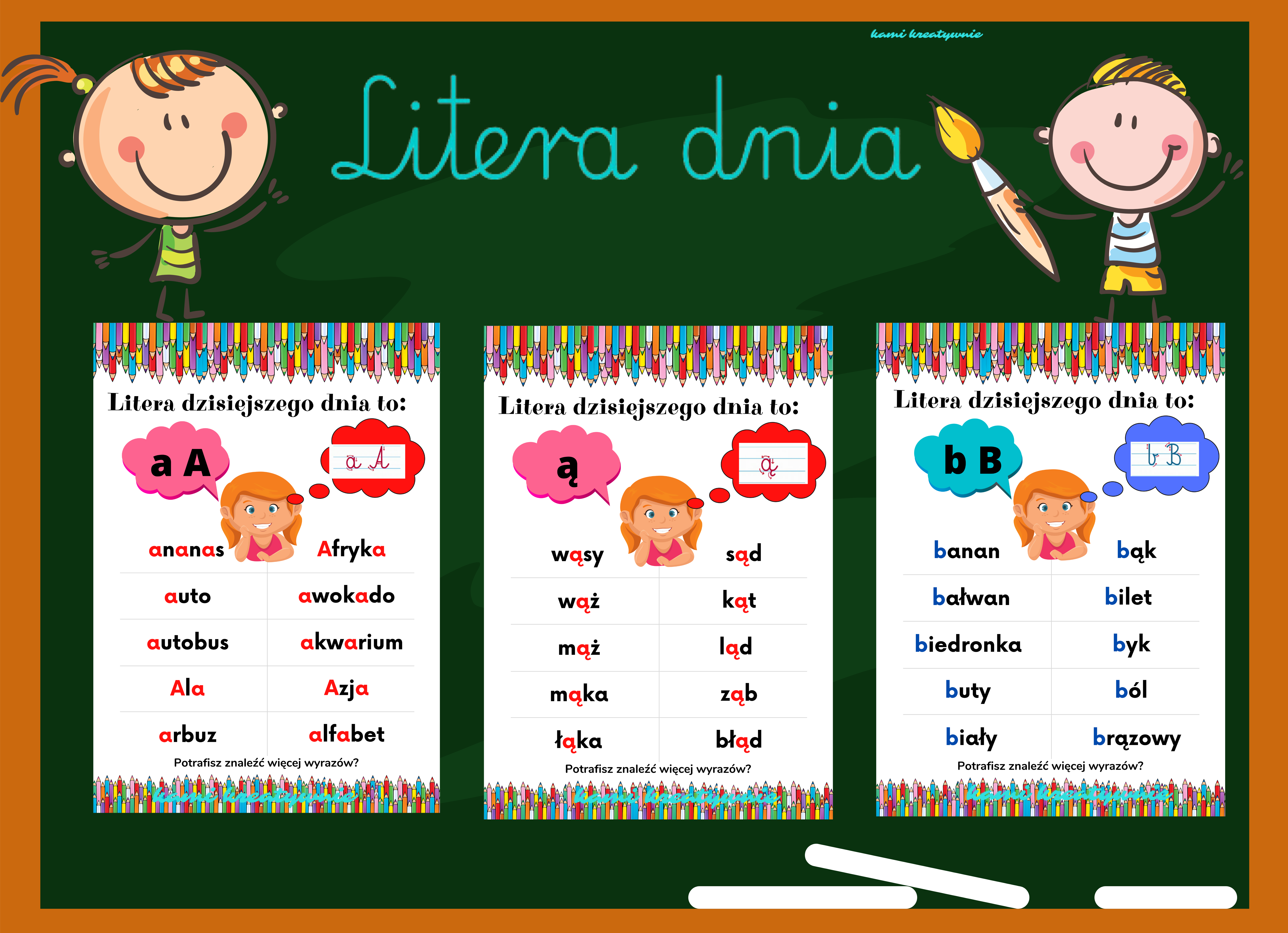 W materiale znajdziesz plansze ze wszystkimi literami polskiego alfabetu i przykładami wyrazów.