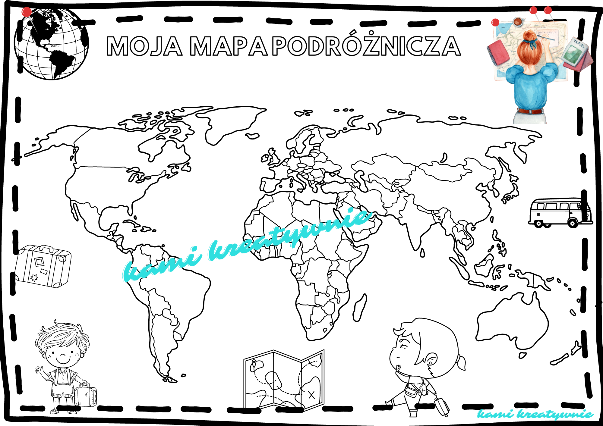 karty a4. Na mapie można wbijać szpilki bądź pinezki. Na karcie a4 można kolorować odwiedzone miejsce