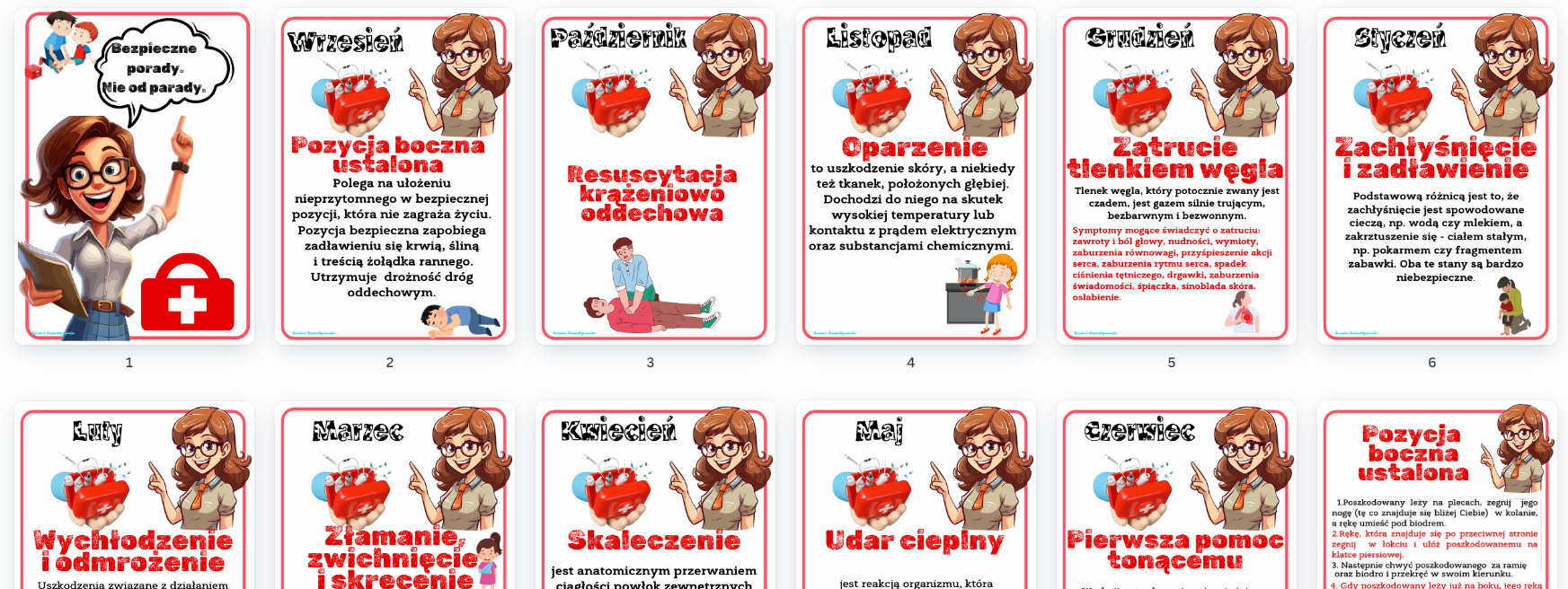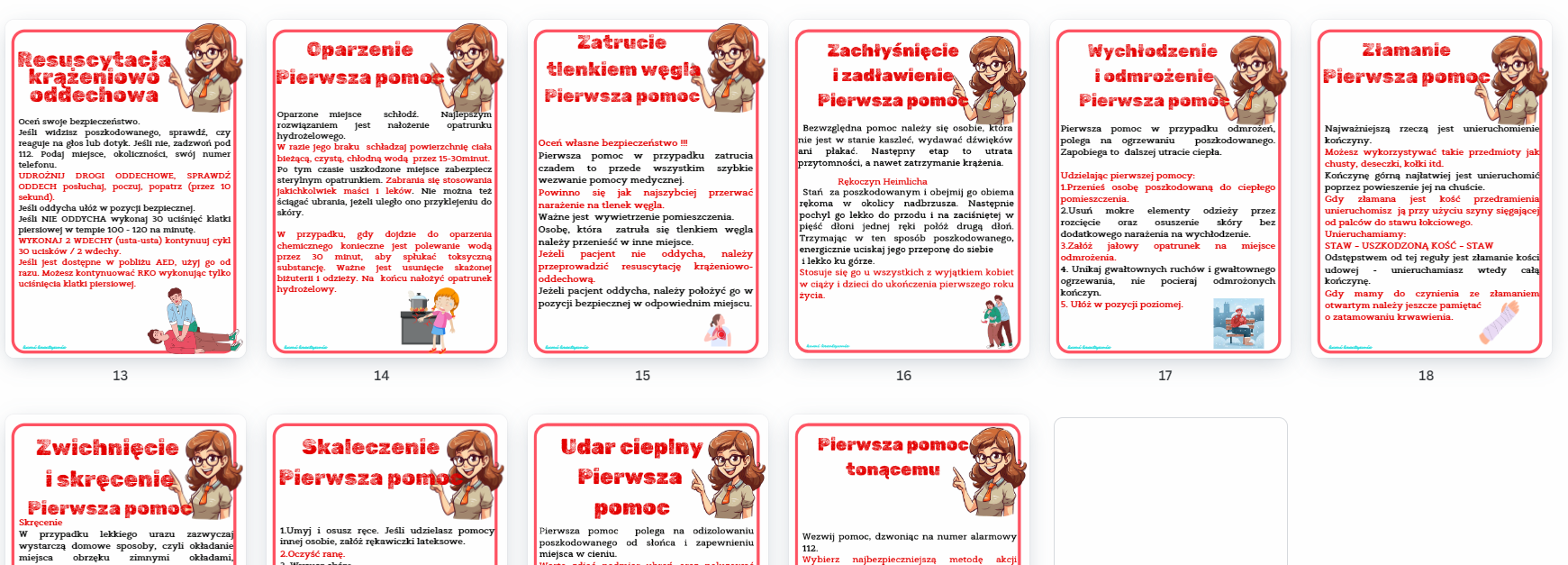 Do każdego tematu – minimum 2 plansze. Definicja oraz pierwsza pomoc.