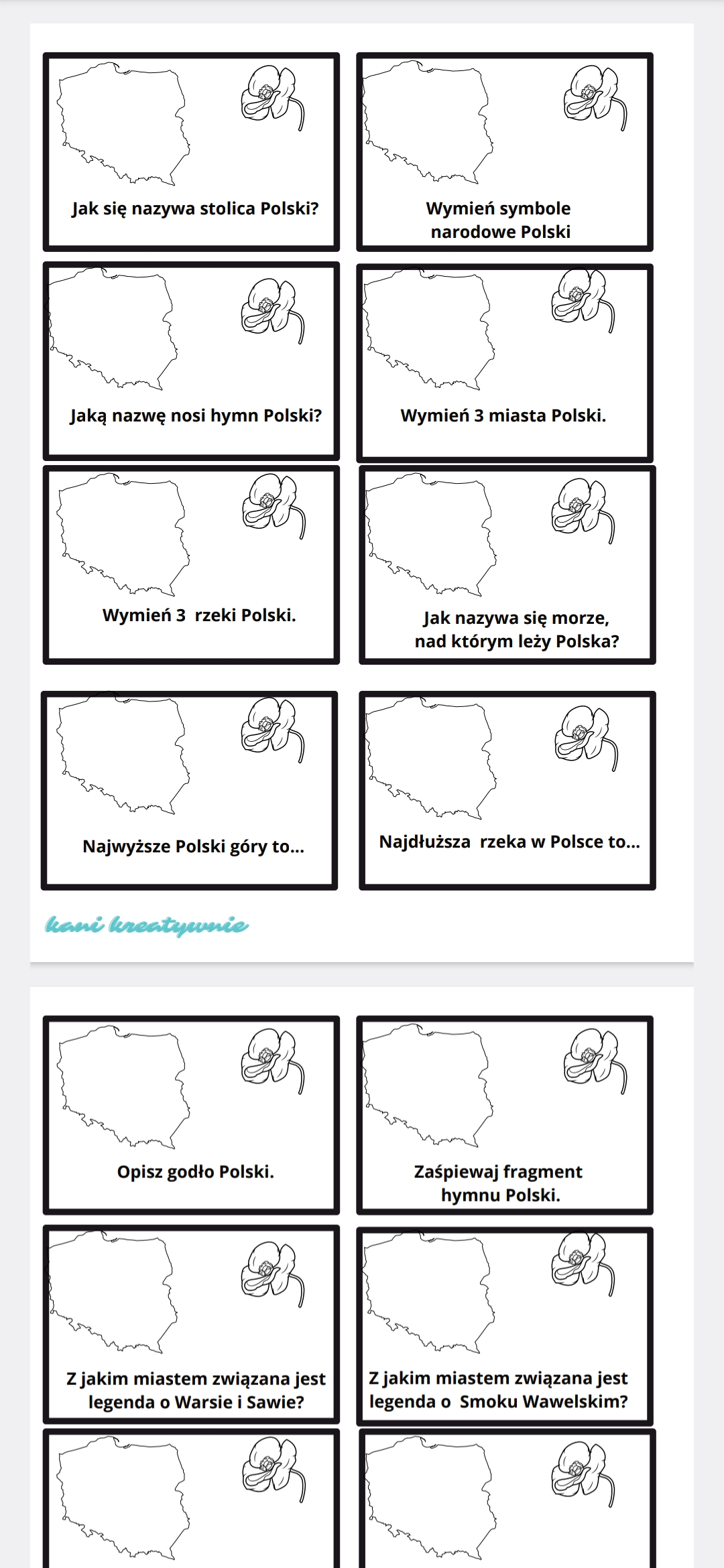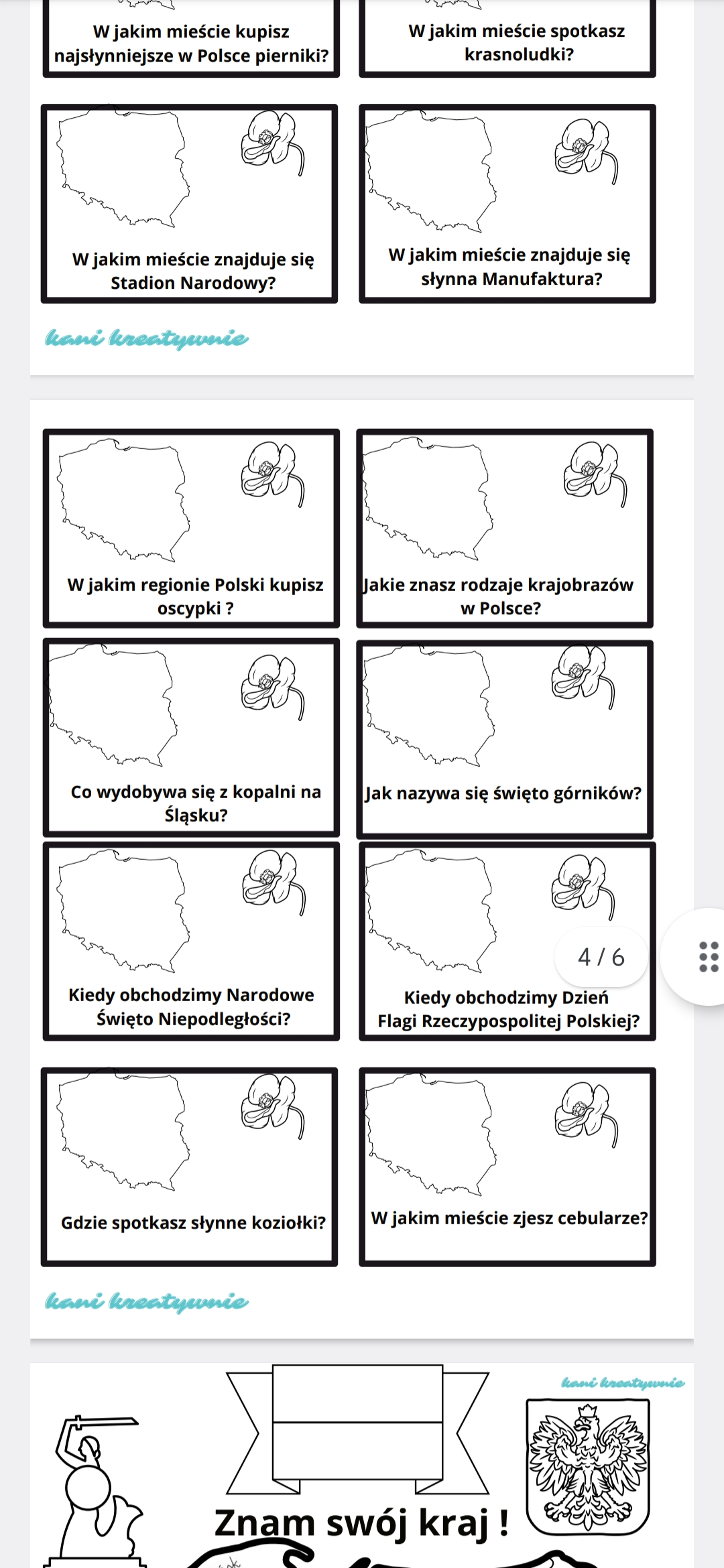 Należy poukrywać kartoniki z pytaniami. Uczniowie szukają i odpowiadają na pytania. Za dobrą odpowiedź dostają symbol związany z danym regionem, który muszą przykleić na karcie z Polską. Kartoników jest 32, uczeń ma zebrać 16. Jest to alternatywa, gdyby np. czegoś dziecko nie wiedziało, może wtedy odnaleźć łatwiejsze pytanie