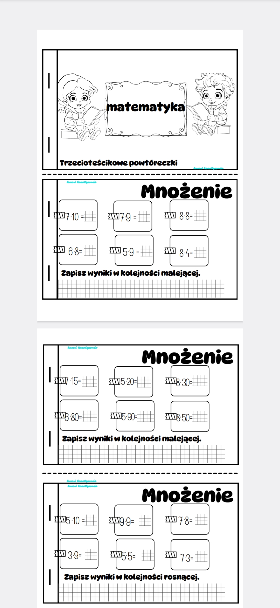 W materiale 57 powtórek (w formacie a5) z matematyki. Jedna powtóreczka na dzień.