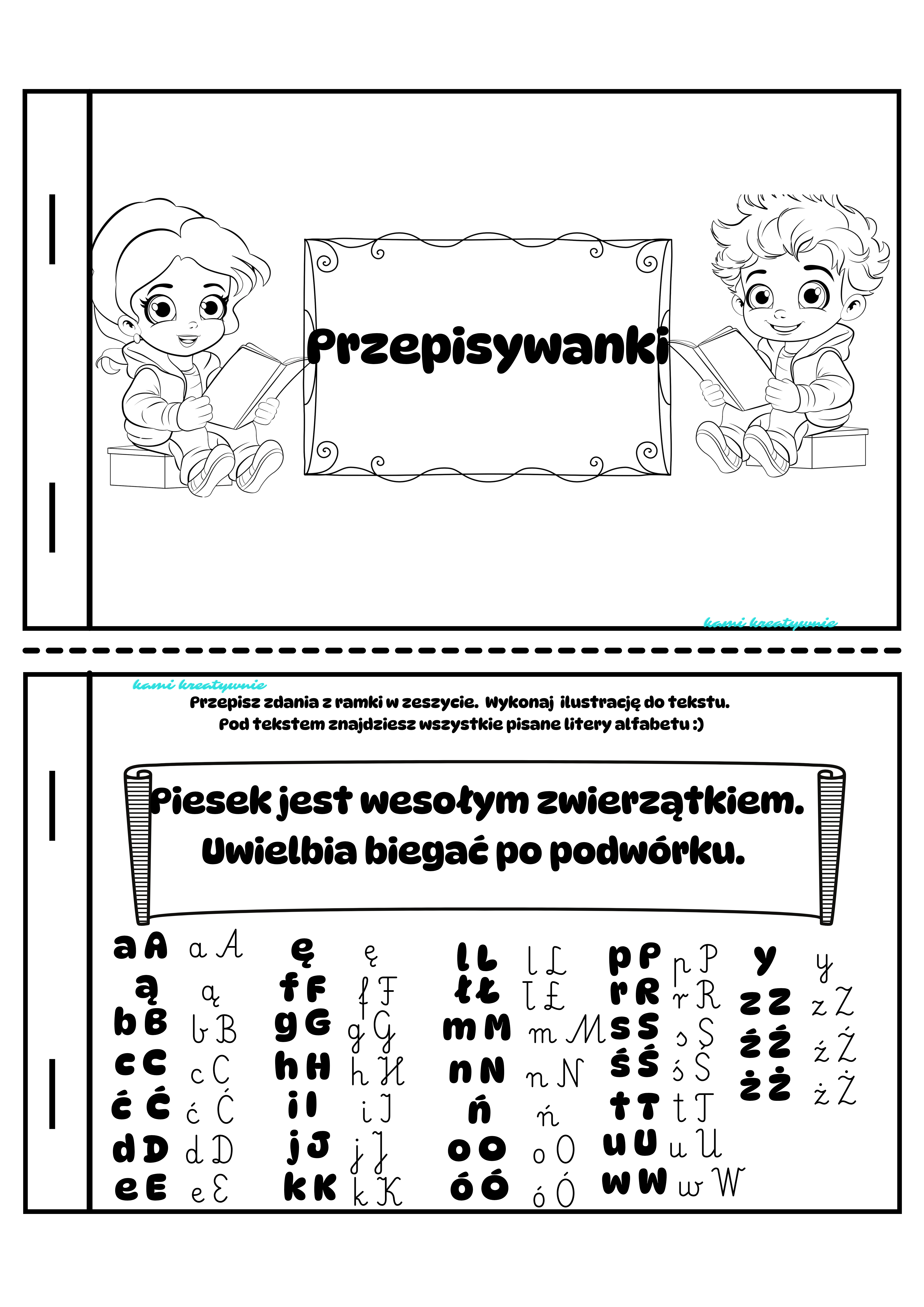 Przepisywanki to pakiecik z 24 wklejeczkami do zeszytu, na których znajdziecie zdania do przepisywania oraz wzór wszystkich liter pisanych polskiego alfabetu, co bardzo ułatwi dzieciom pracę.
