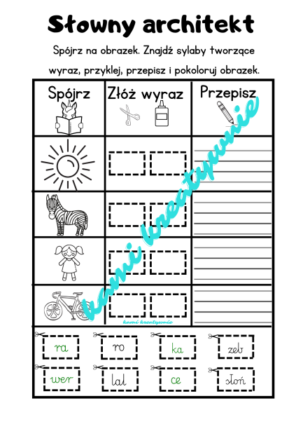 Spójrz, dopasuj sylaby- ułóż wyraz. Wytnij, przyklej, przepisz. Na końcu pokoloruj obrazek