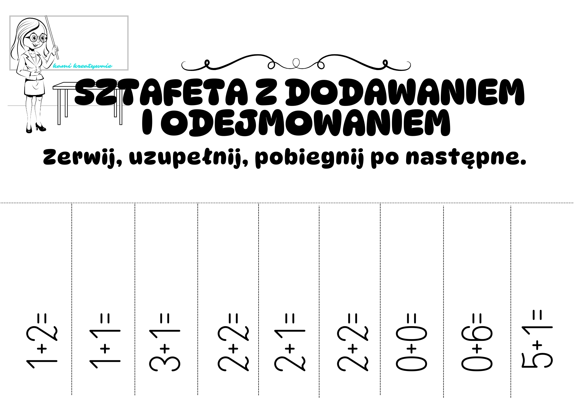5 kart z dodawanie i 5 kart z odejmowanie w zakresie 20 bez przekraczania progu.