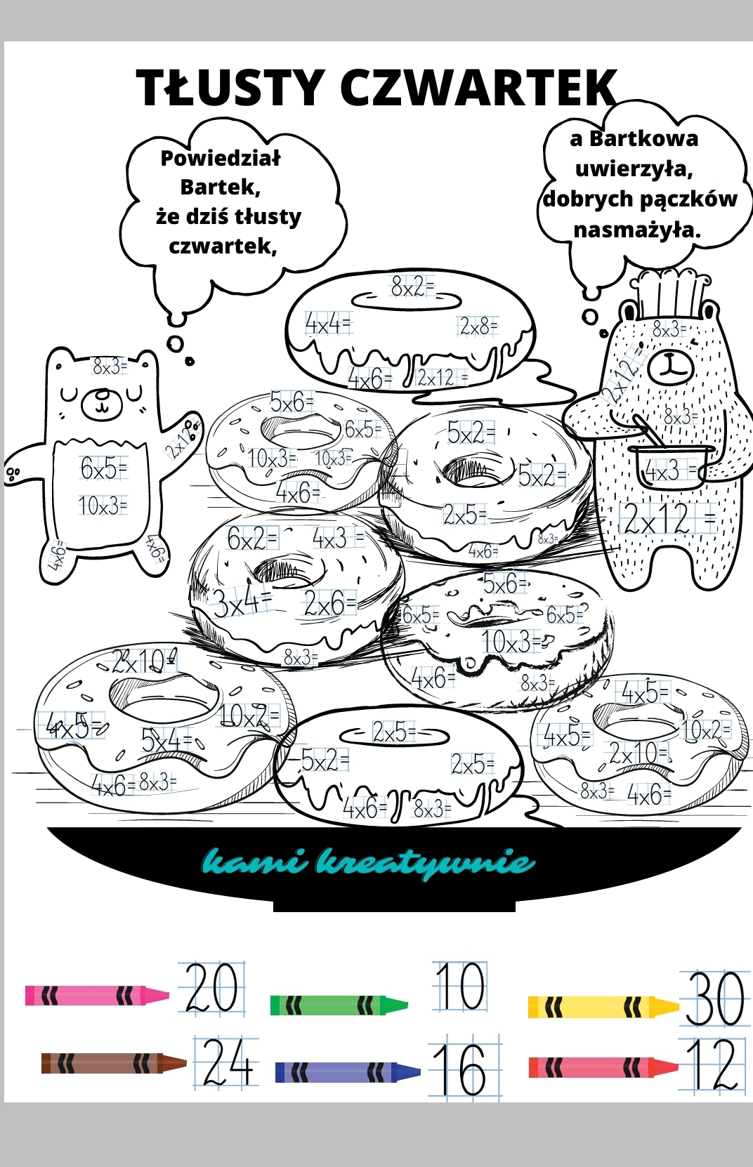 Materiał zawiera plakat xxl – 9 kartek a4 oraz taką samą kartę A4. Na plakacie – pączki z działaniami-mnożenie oraz przysłowie. Plakat zawiera marginesy do lepszego dopasowania.