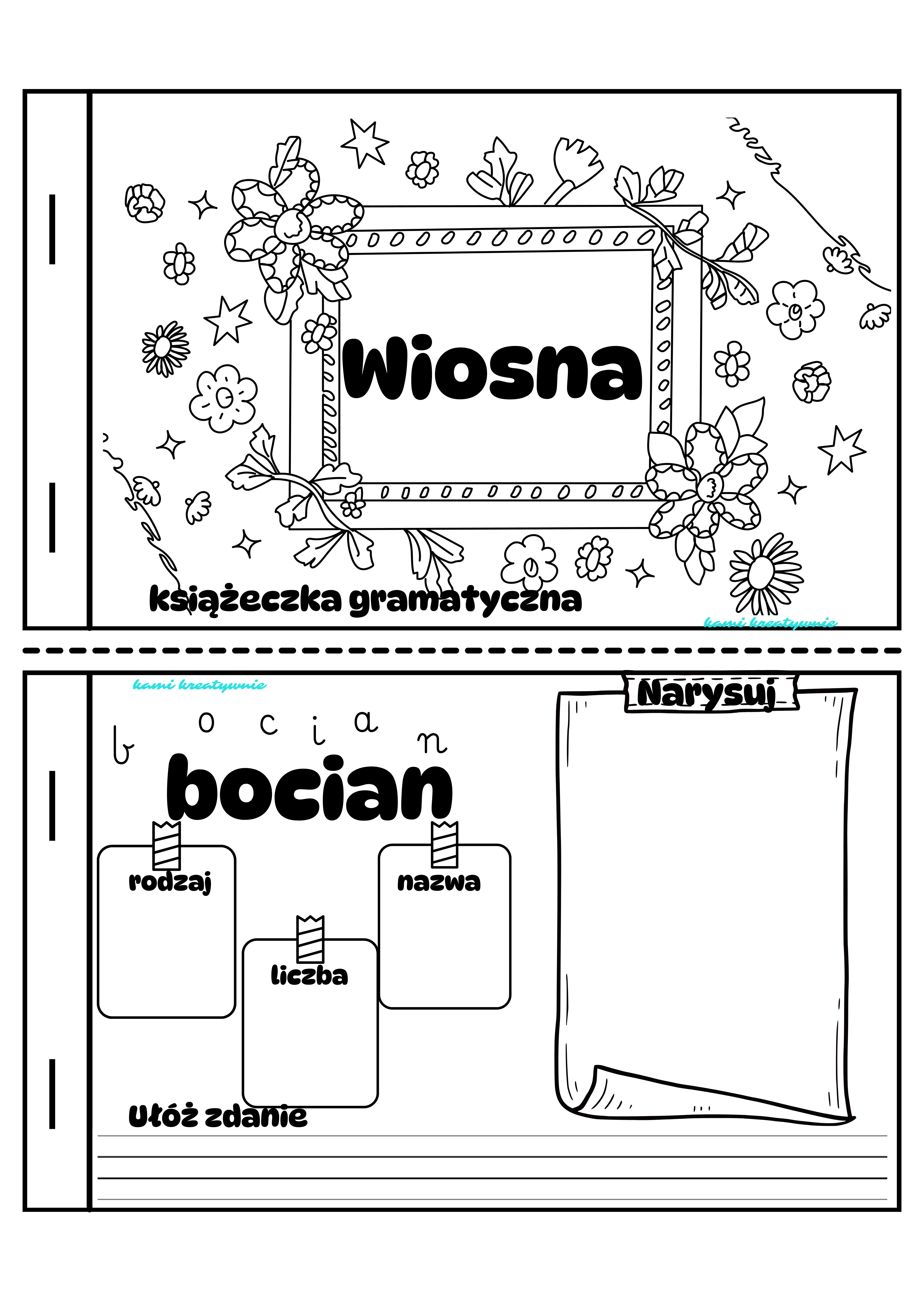 W materiale 10 stron – 19 przykładów wiosennych rzeczowników. Możecie z uczniami wykonać gramatyczną książeczkę.
