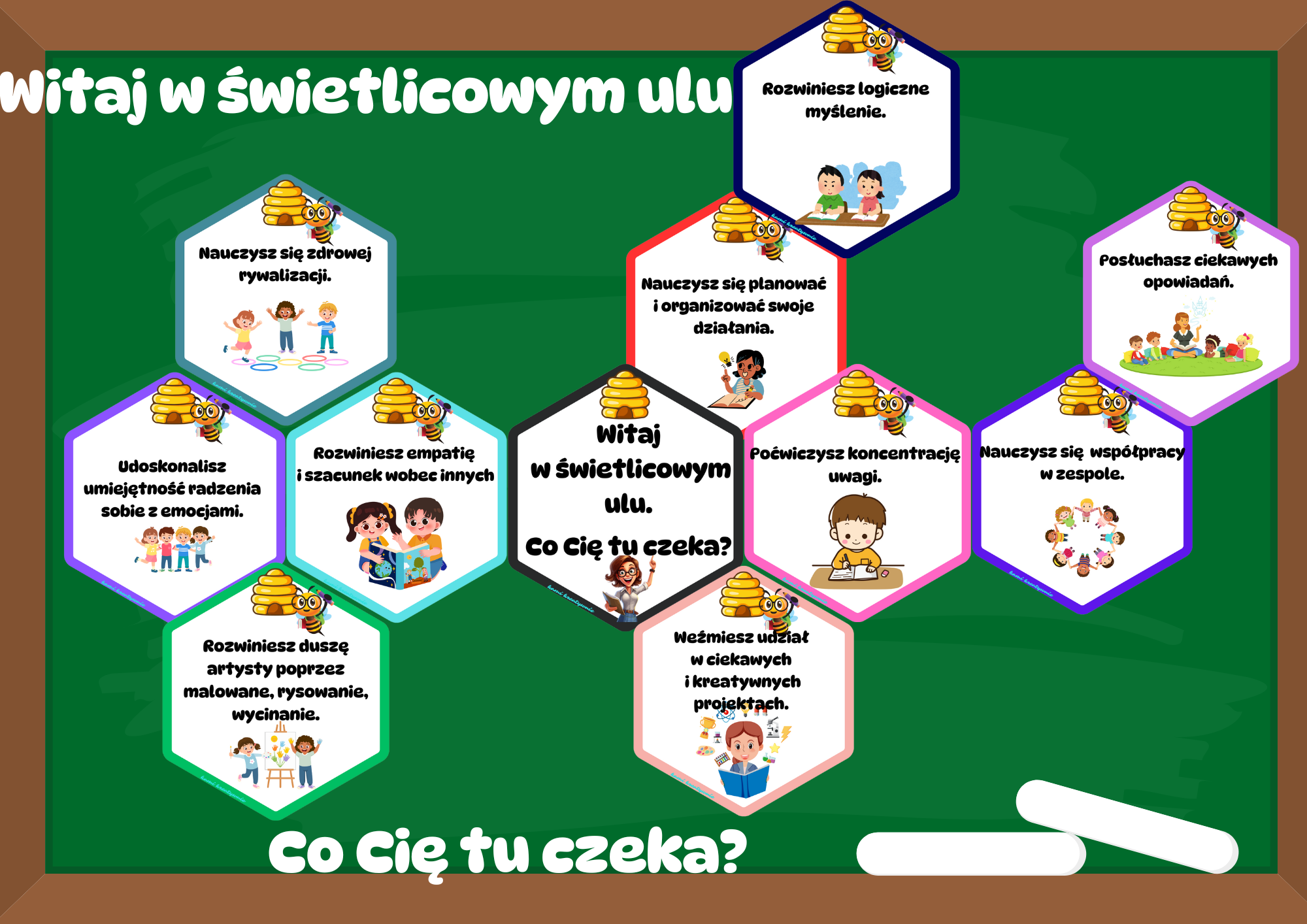 Szukasz pomysłu, jak uatrakcyjnić pracę świetlicy i jednocześnie wspierać rozwój dzieci? Mój kolorowy i angażujący plakat edukacyjny „Witaj w świetlicowym ulu” to idealne narzędzie dla każdego nauczyciela świetlicy!