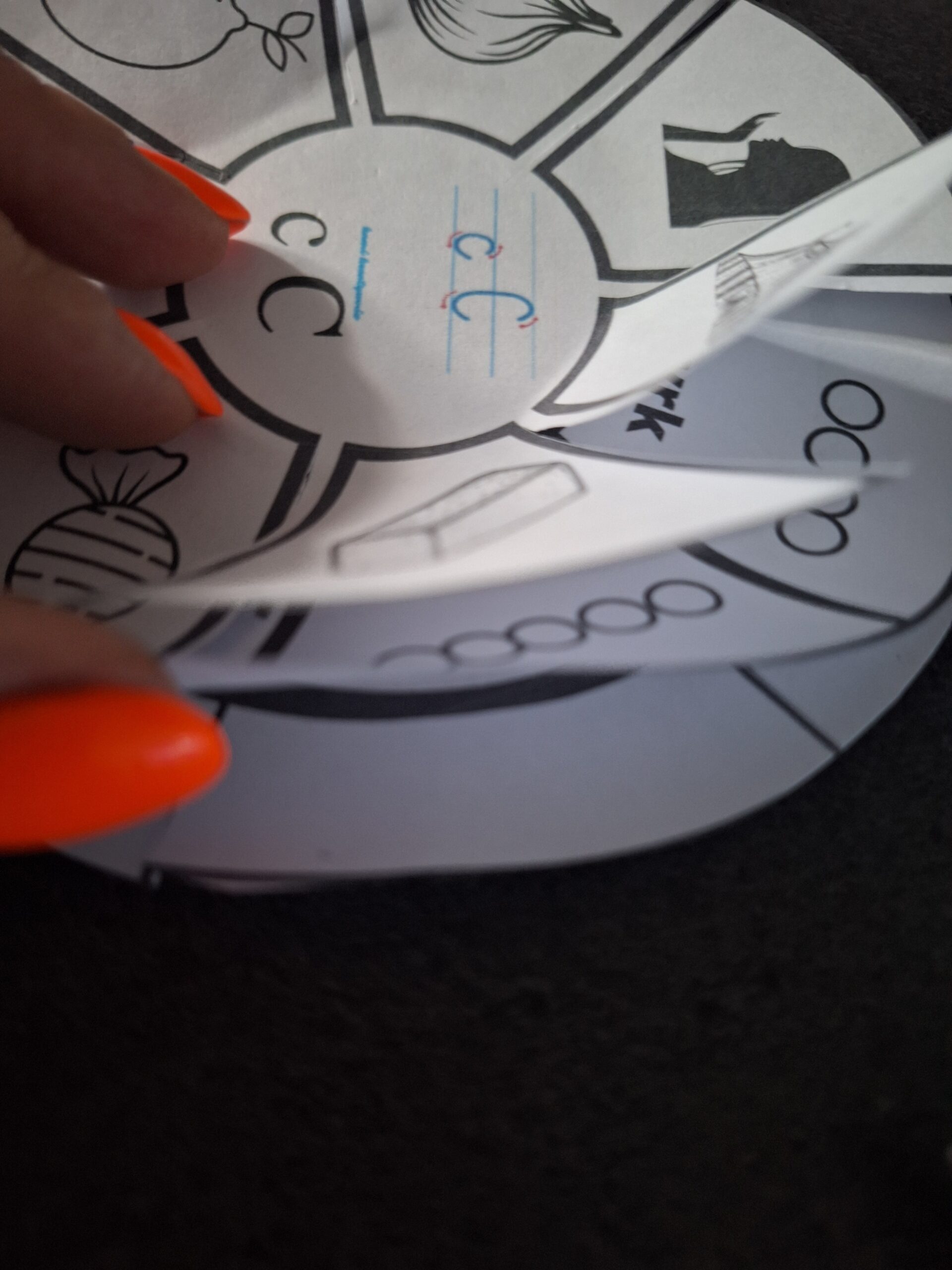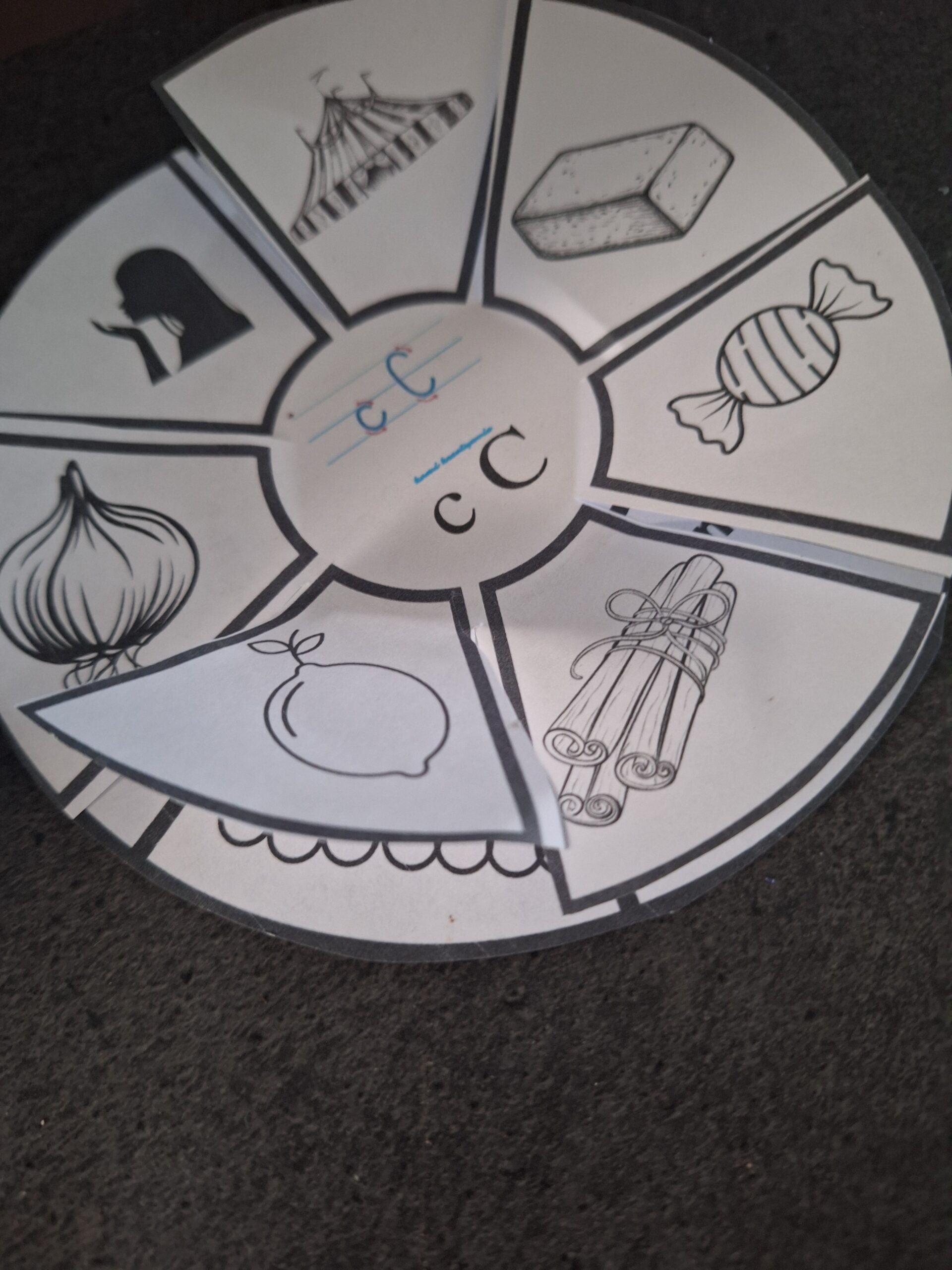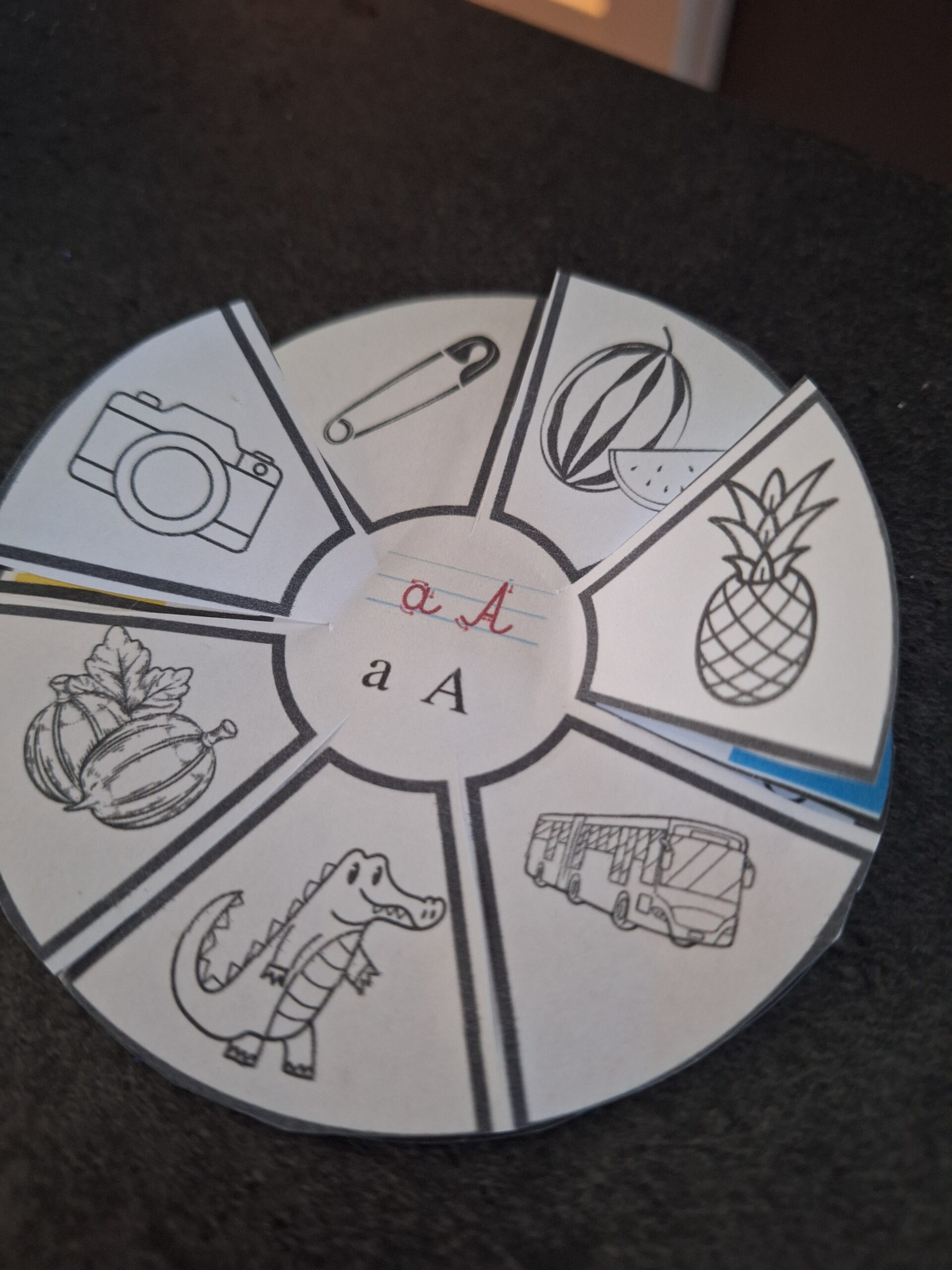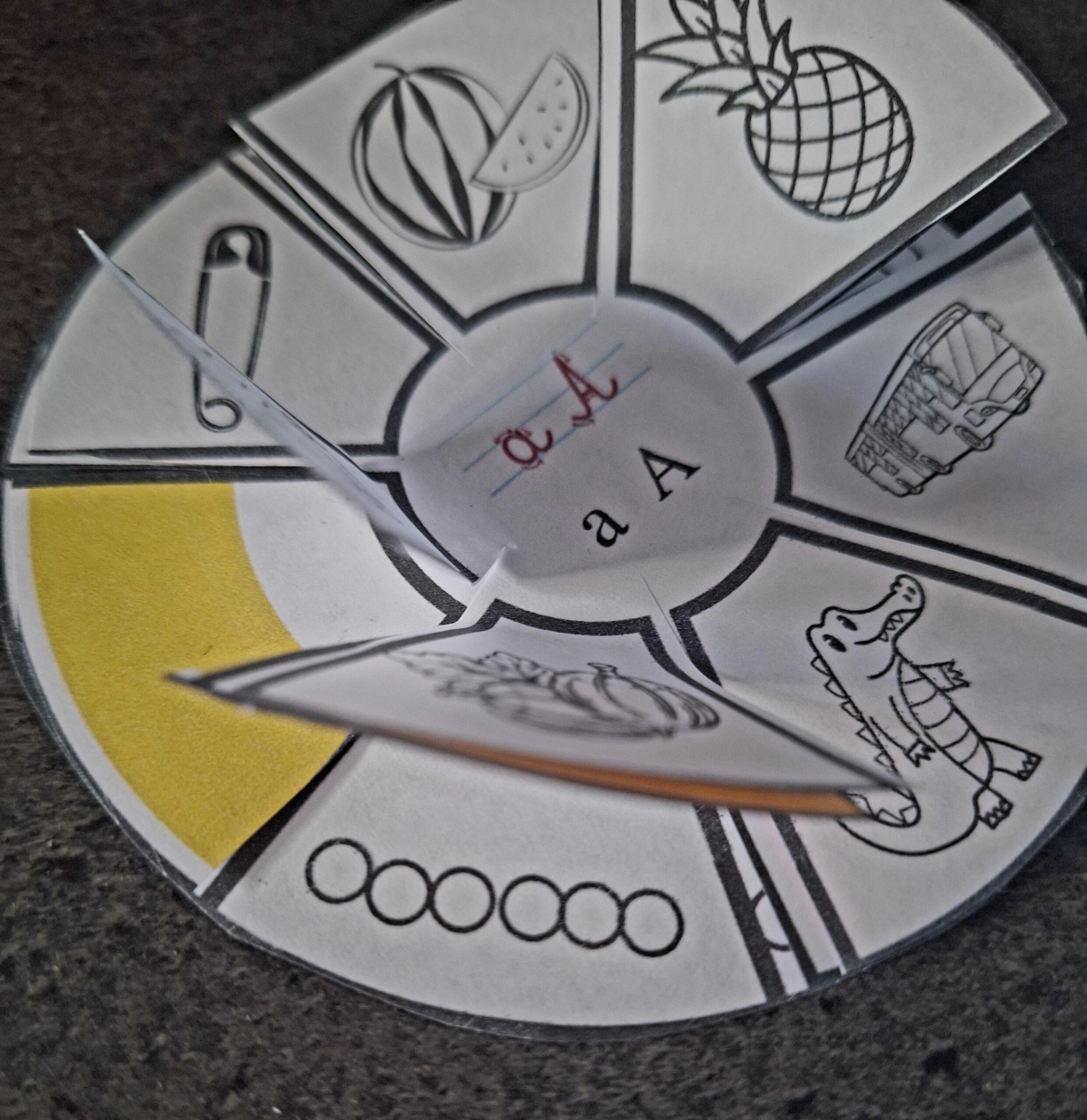 Zadaniem dziecka jest wyciąć i dopasować dwie okrągłe wklejki z obrazkiem, wyrazem globalnym i modelem głoskowym.