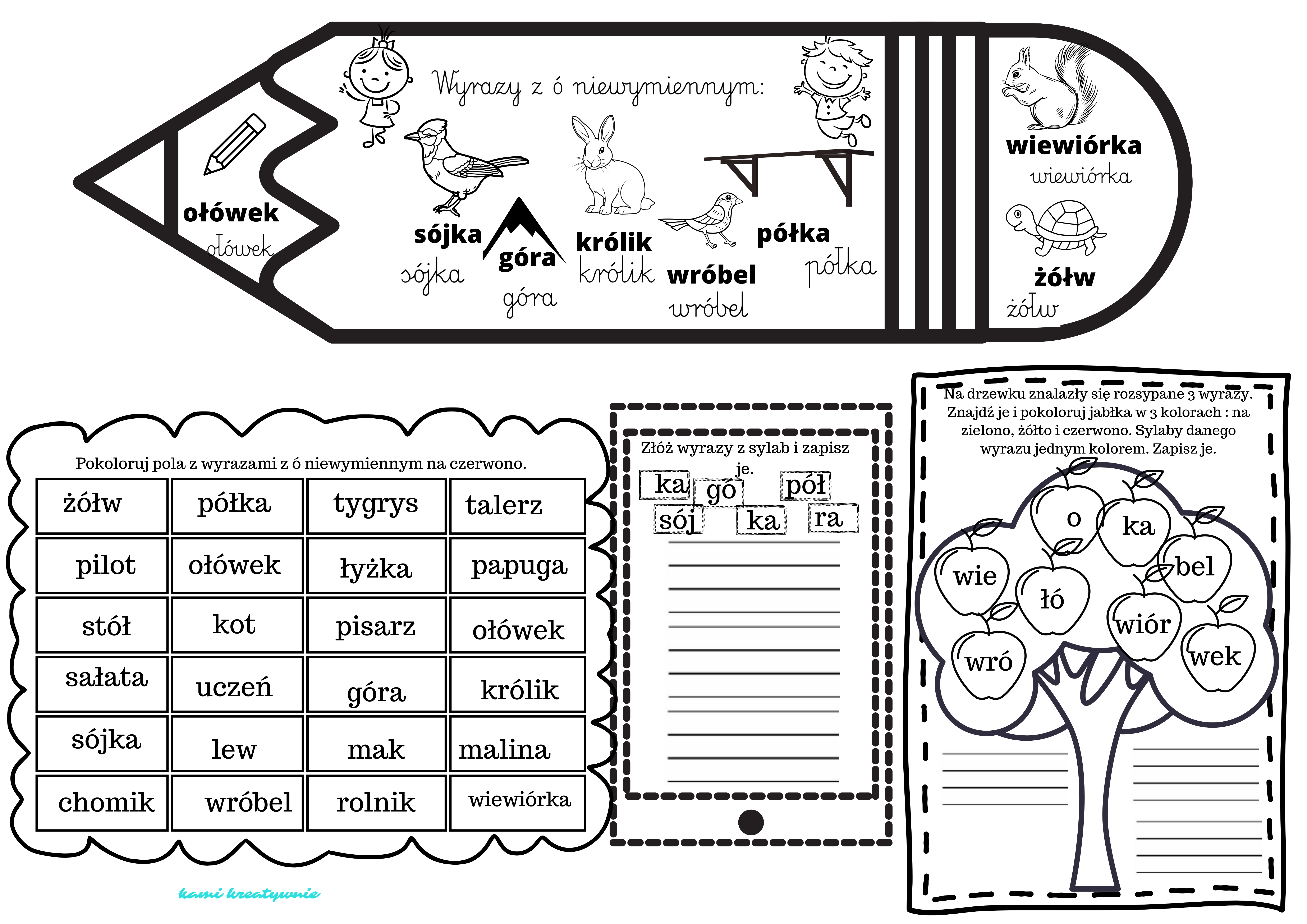 W materiale e-book i 31 kart z wklejkami do wprowadzenia ortografii. Jest to słowniczek wykonany w bardzo atrakcyjnej dla dziecka formie.