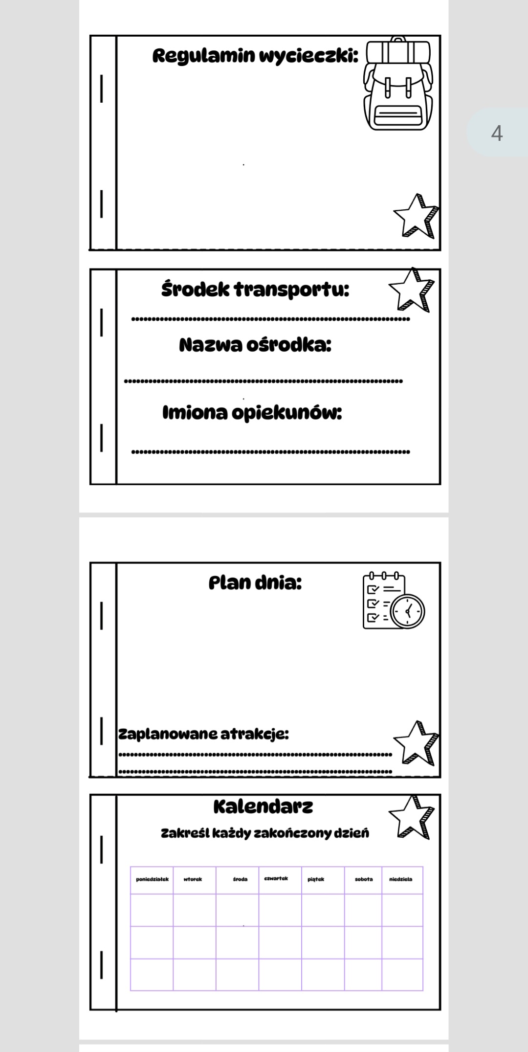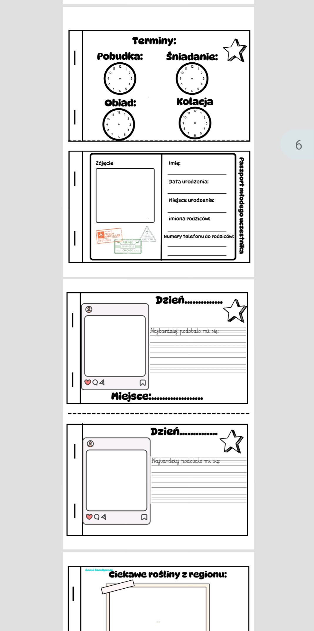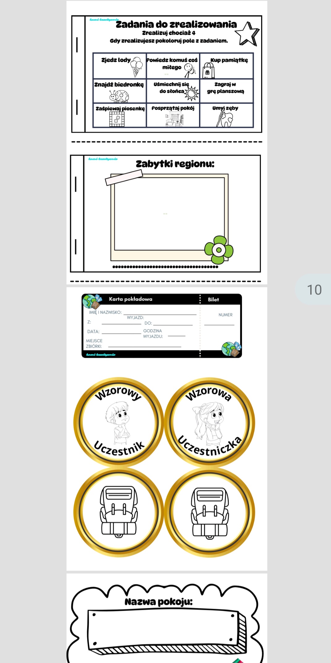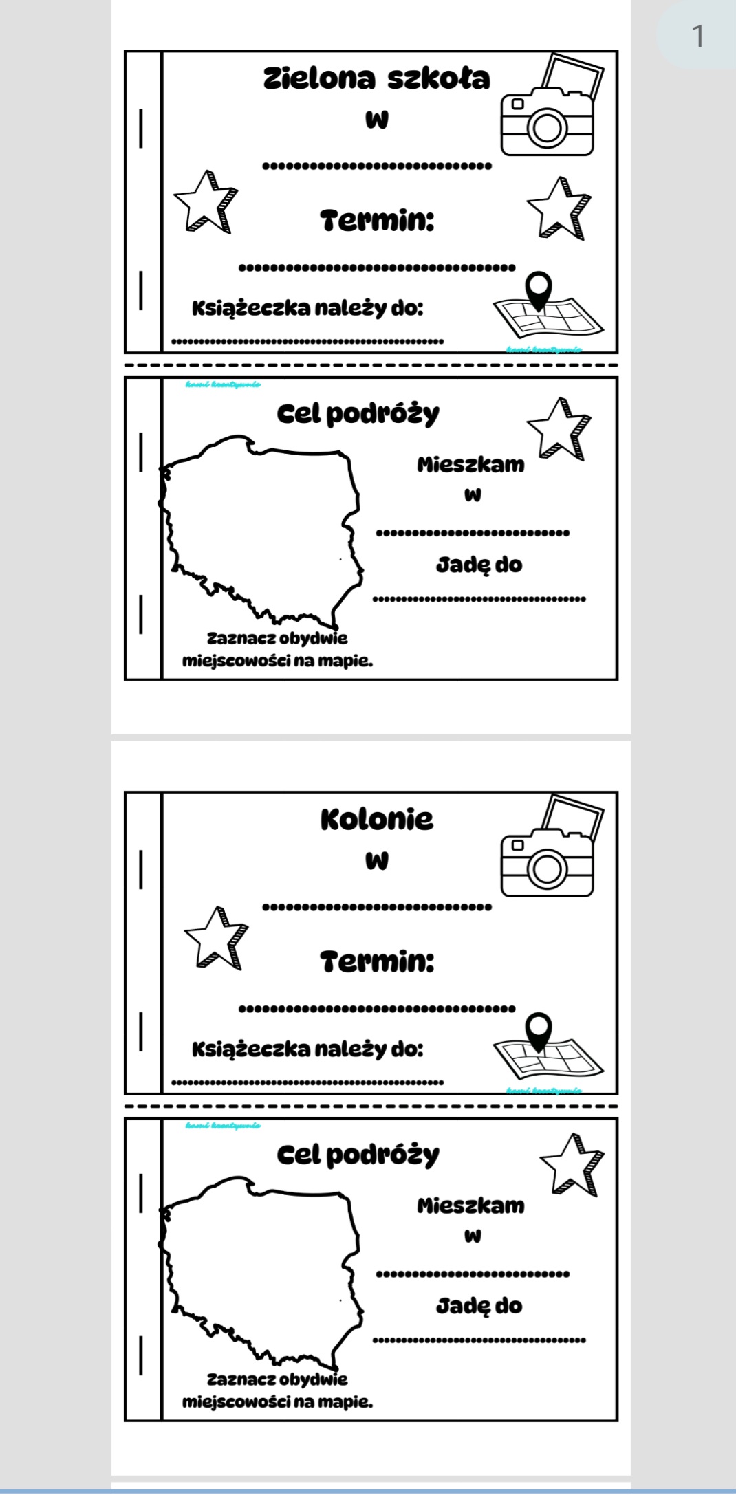 W materiale znajdziesz karty do wykonania książeczki podczas pobytu na Zielonej szkole bądź koloniach. Dodatkowo uniwersalne dyplomy-7 do różnych aktywności, dyplom udziału, medal uczestnika, karta pokładowa, tabelka czystości, nazwa pokoju.